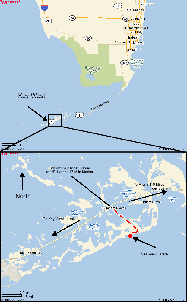 | From Miami - US 1 to Mile Marker 17. Turn left at Sugarloaf Shores. Follow road 2 1/2 miles to the end. Turn right and drive 1/2 mile. Look for white Mailbox on left # 16650. Sea View Estate 16650 Old State Road 4-A Sugarloaf Key, FL 33042 305-745-8832 SeaViewEstate@aol.com |
